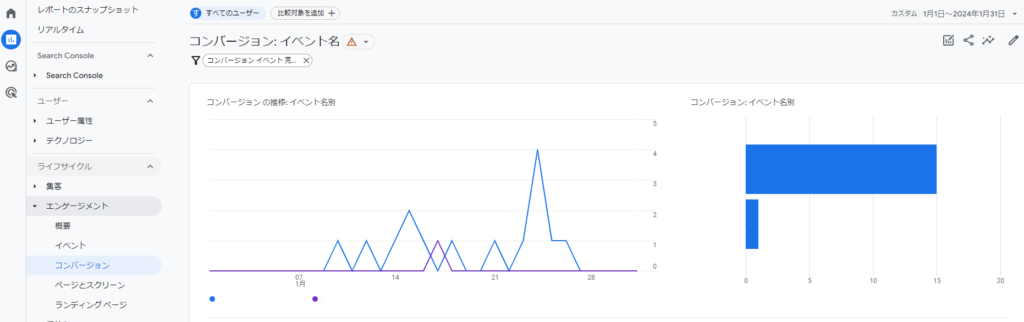 [レポート]-[ライフサイクル]-[エンゲージメント]-[コンバージョン]より確認できます。