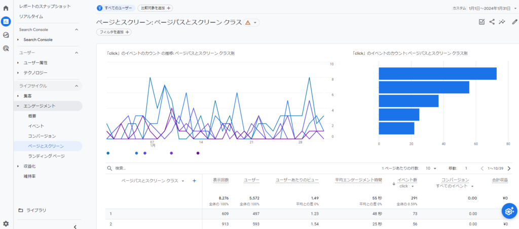 ユーザー数が少なければ、集客施策やそのページまでの導線設計を改善したり、平均エンゲージメント時間が短いのであれば、しっかり読まれるようにコンテンツの改善が必要ということがわかります。