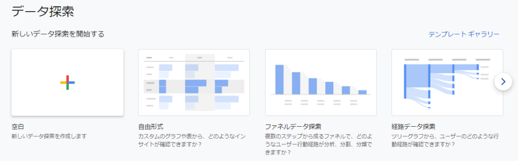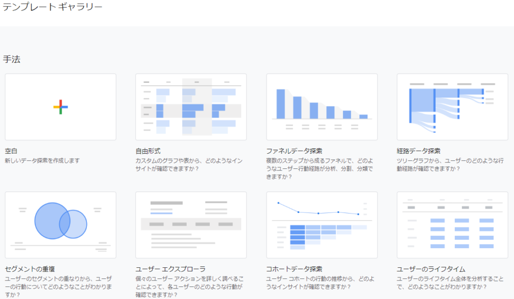 探索では分析の目的に合わせて「自由形式」「ファネルデータ探索」「経路データ探索」「セグメントの重複」「ユーザー エクスプローラ」「コホートデータ探索」「ユーザーのライフタイム」といったテンプレートが用意されています。