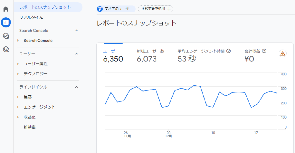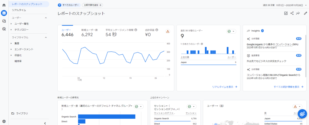 「レポート」では、GA4で計測した基本的なデータを確認することができます。