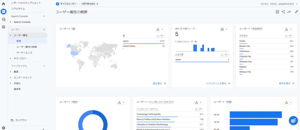 「Search Console」「ユーザー」「ライフサイクル」はさらに分類されており、データを確認することができます。