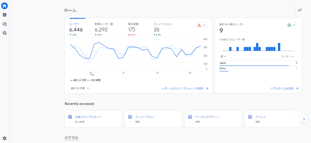 「ホーム」では、サイト全体のユーザー数や表示回数といった数値、過去30分間のユーザー、最近アクセスしたレポート、おすすめレポート、分析情報と最適化案などが確認できます。