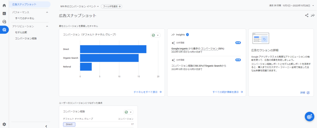 「広告」では、Google広告アカウントと連携することで、設定したコンバージョンのデータが把握できます。