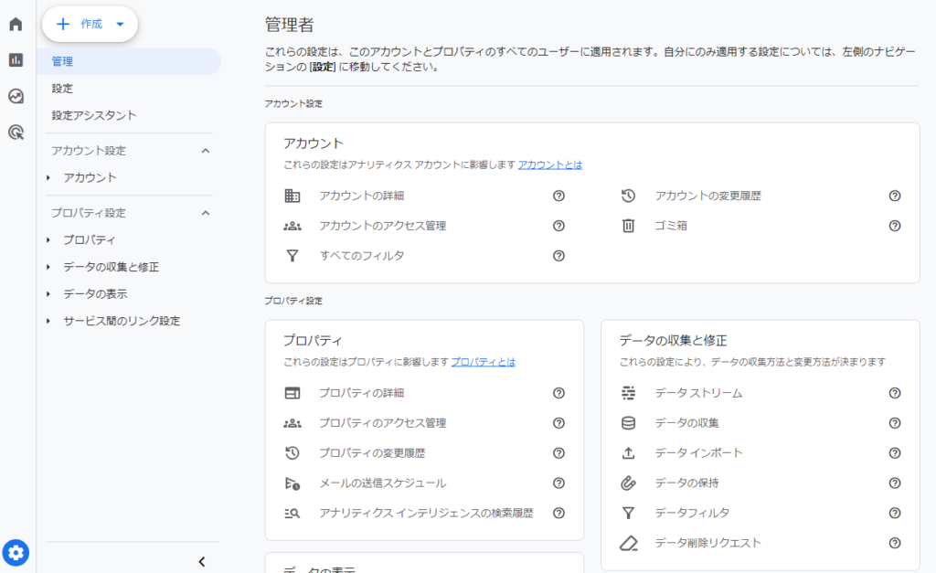 アカウントへのアクセス権限の管理やデータの収集方法の変更、Google広告やBigQueryなどのサービスとの連携も設定できます。