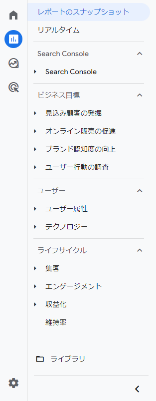 「レポートのスナップショット」「リアルタイム」「Search Console」「ユーザー」「ライフサイクル」と5項目に分類されています。
