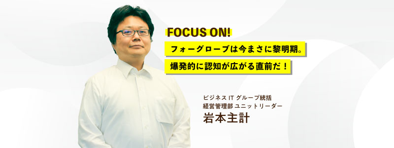 「フォーグローブは今まさに黎明期。爆発的に認知が広がる直前だ!」と語るビジネスITグループ統括、経営管理部・ユニットリーダーの岩本主計さん。2021年10月に入社後、会社が新規事業に驀進する日々を経営管理部で支え続けてきました。2年余りが経った今、岩本さんが感じていること、フォーグローブへの想いを語ってもらいました。