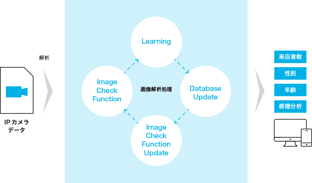 IPカメラを店舗内に設置し、機械学習(画像認識)によって来店者データ(来店客数/年齢/性別)を取得。カメラを活用した解析の仕組みと、データ可視化のための店舗解析プラットフォームを提供。
