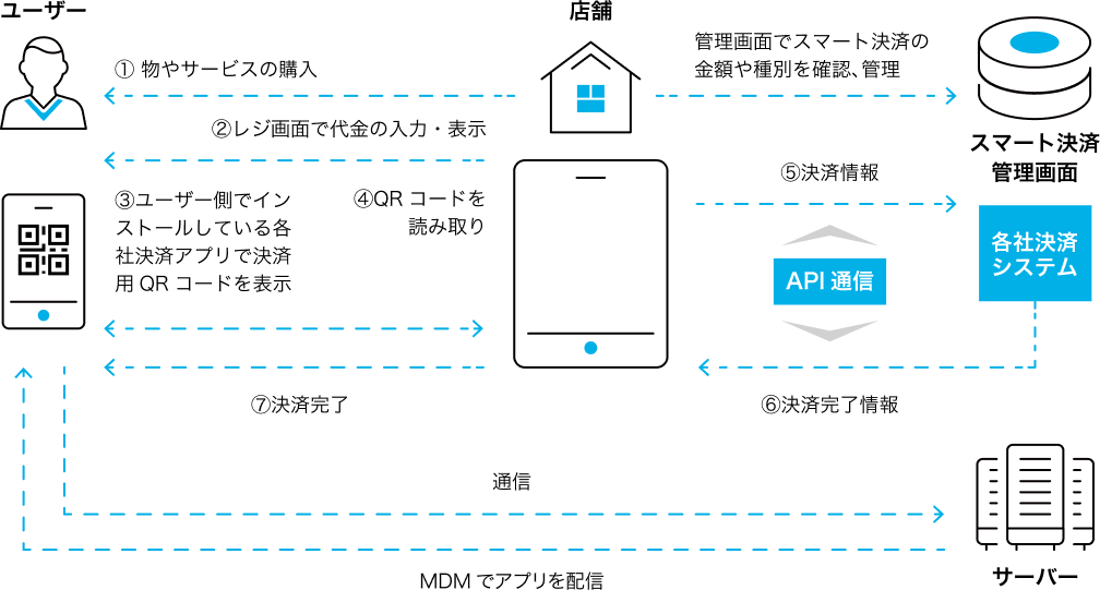 利用者が店舗のタブレットでキャッシュレス決済を行うと、API通信でバックエンドサーバーに決済データが送られる。決済データを受け取ったサーバーはデータ処理をして、指定された決済事業者へ決済データを送る。