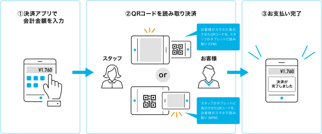 店舗に置かれたタブレット上でアプリを開き、お客さまが指定したペイサービスを選んで金額を入力してタブレットのカメラで読み取って決済を行う。タブレット上にQRコードを表示してお客さまがスマートフォンで読み取ることも可能。
